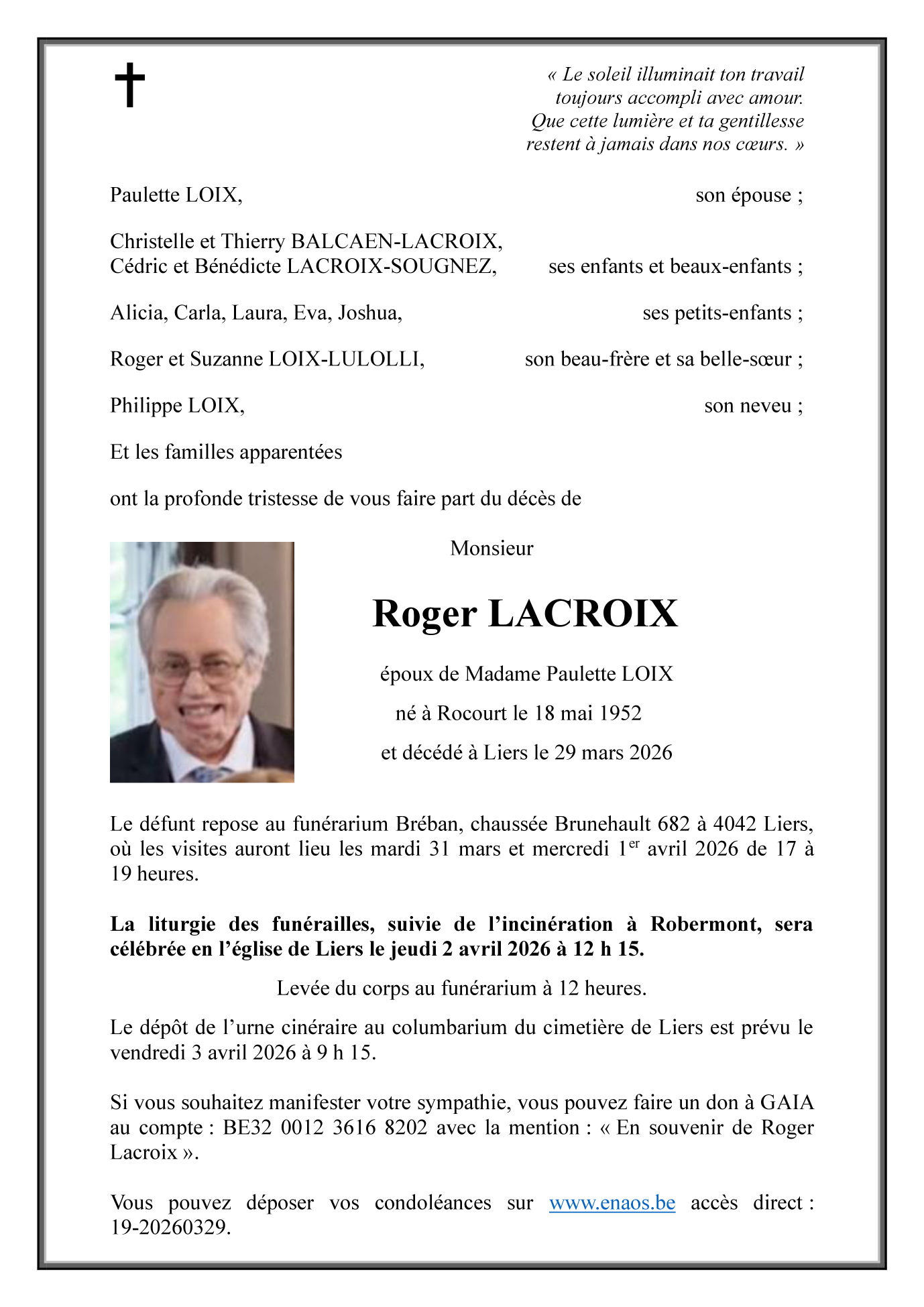 Décédé à Liers (4042) le dimanche 29 mars 2026 à l'âge de 73 ans