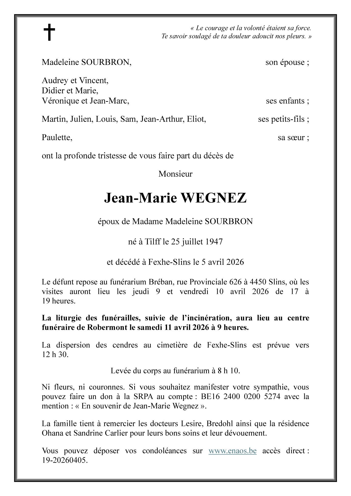 Avis de décès de Monsieur Jean-Marie WEGNEZ époux de Madeleine SOURBRON