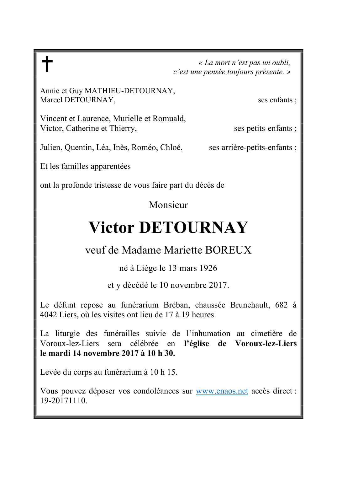 Monsieur Victor DETOURNAY veuf de Mariette BOREUX