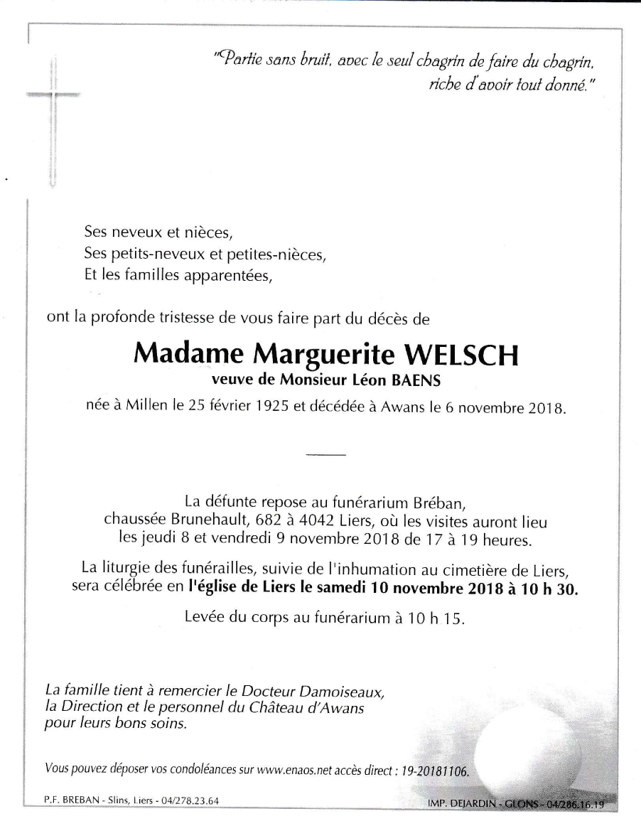 Madame Marguerite WELSCH veuve de Léon BAENS