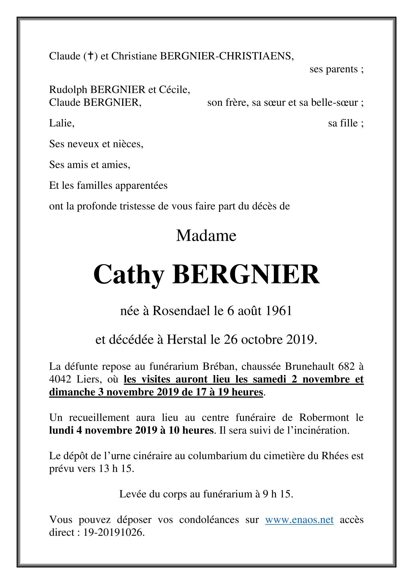 Décédée à Herstal (4040) le samedi 26 octobre 2019 à l'âge de 58 ans