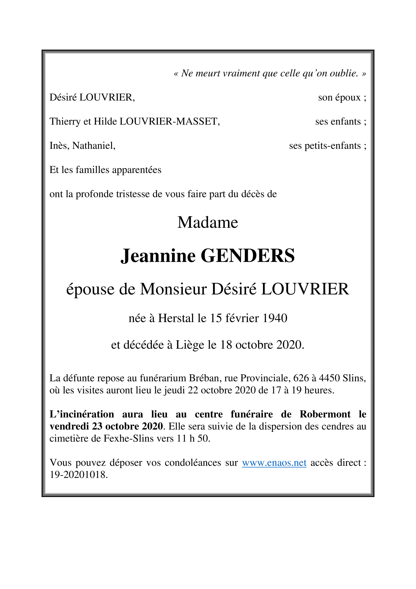 Madame Jeannine GENDERS épouse de Désiré LOUVRIER
