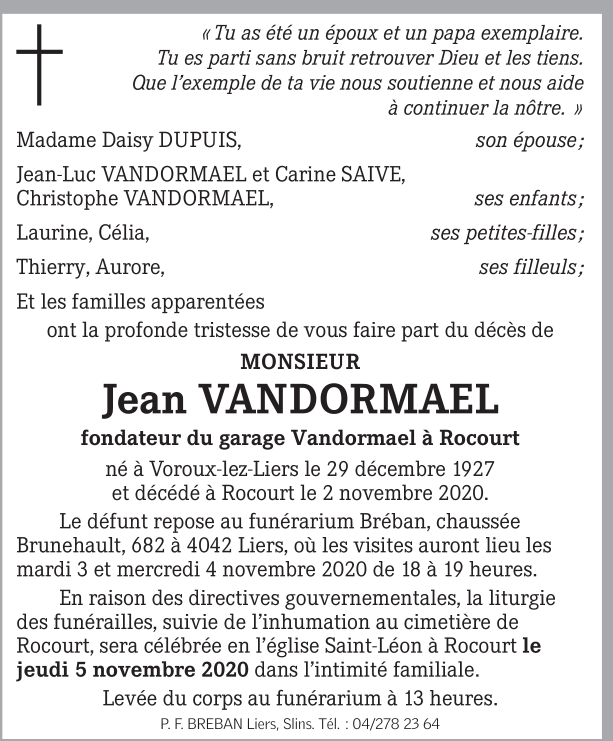 Monsieur Jean VANDORMAEL époux de Daisy DUPUIS