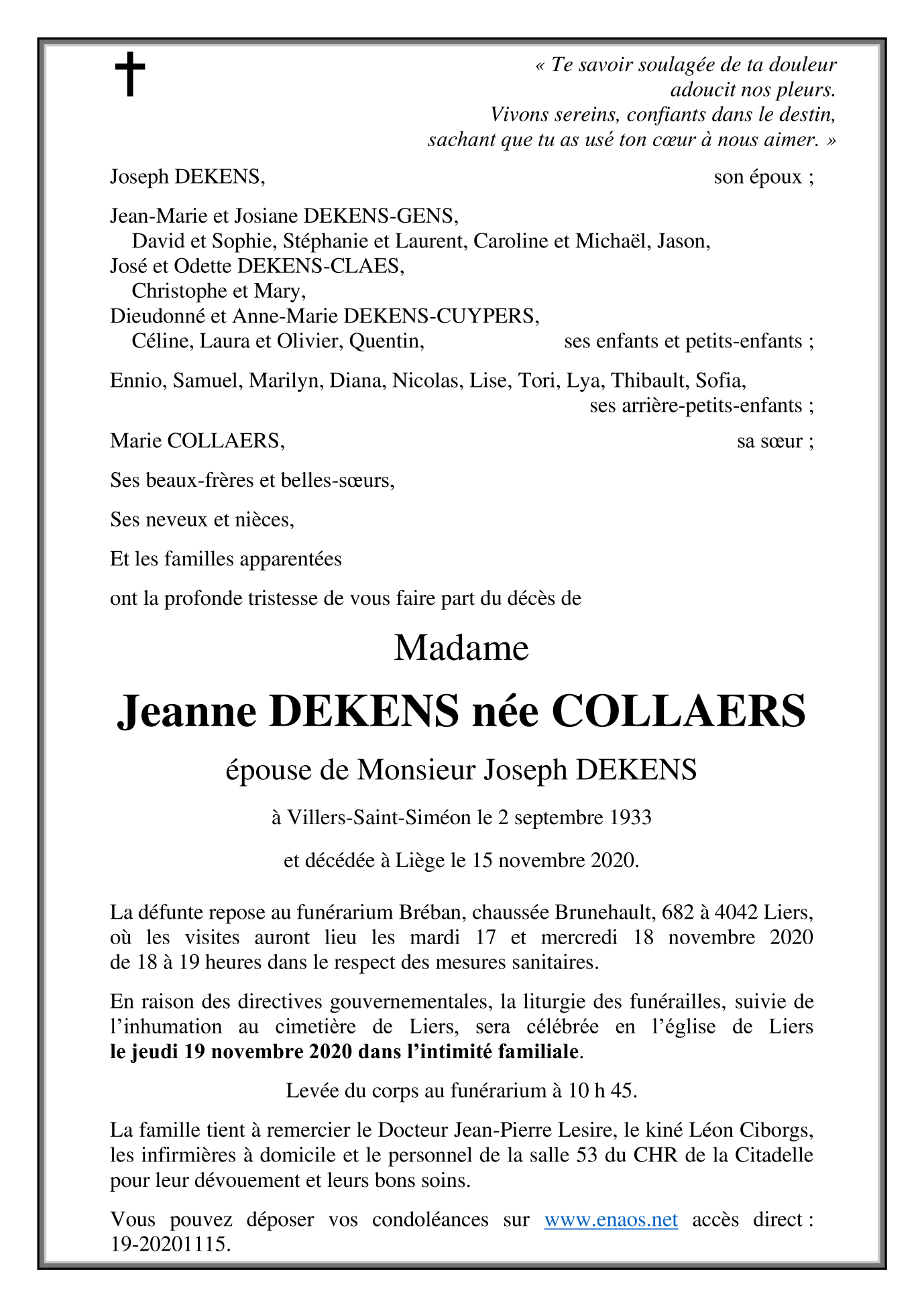 Madame Jeanne COLLAERS épouse de Joseph DEKENS