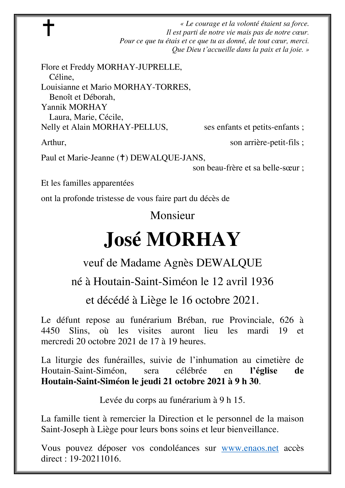 Monsieur José MORHAY veuf de Agnès DEWALQUE