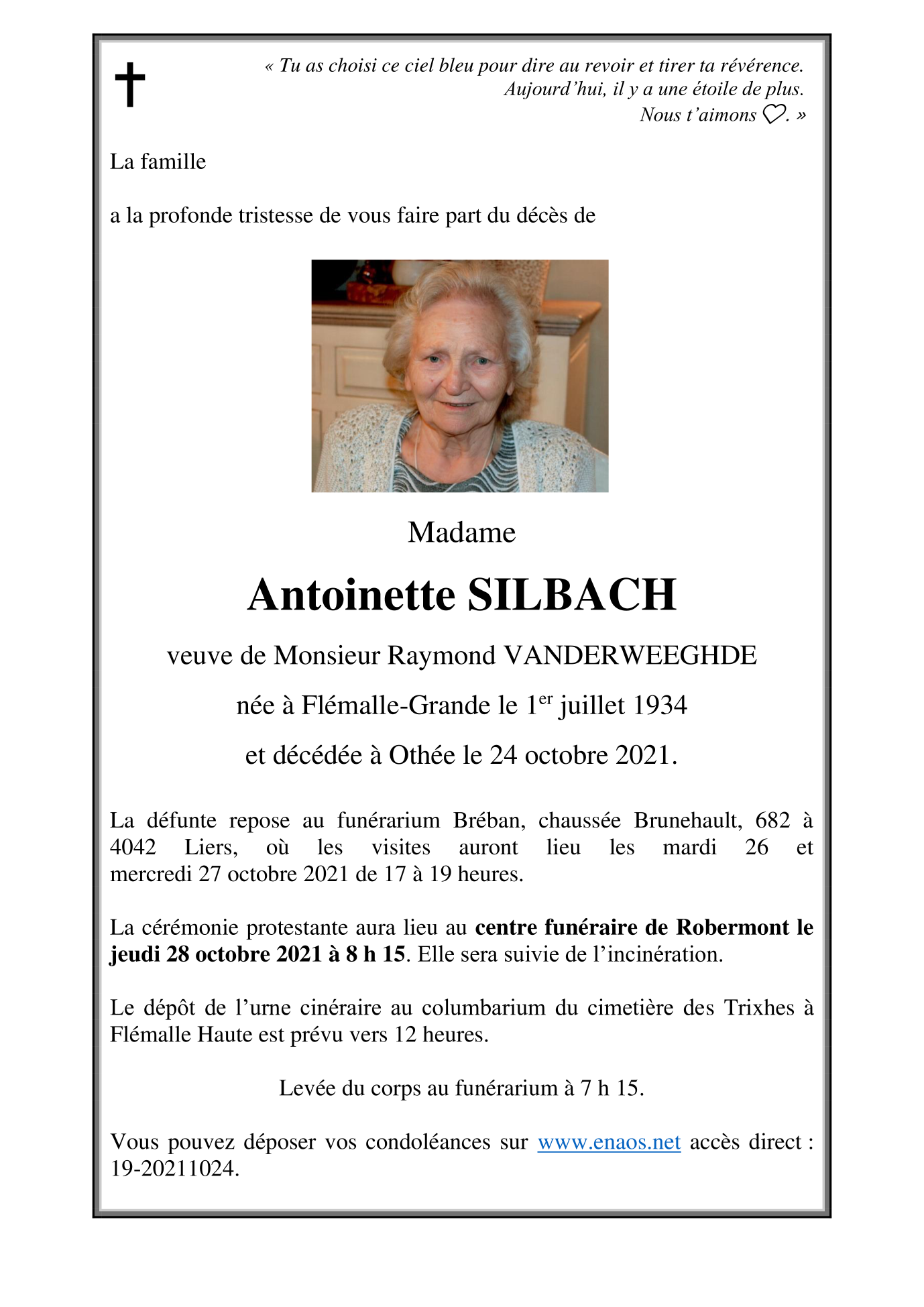 Décédée à Othée (4340) le dimanche 24 octobre 2021 à l'âge de 87 ans