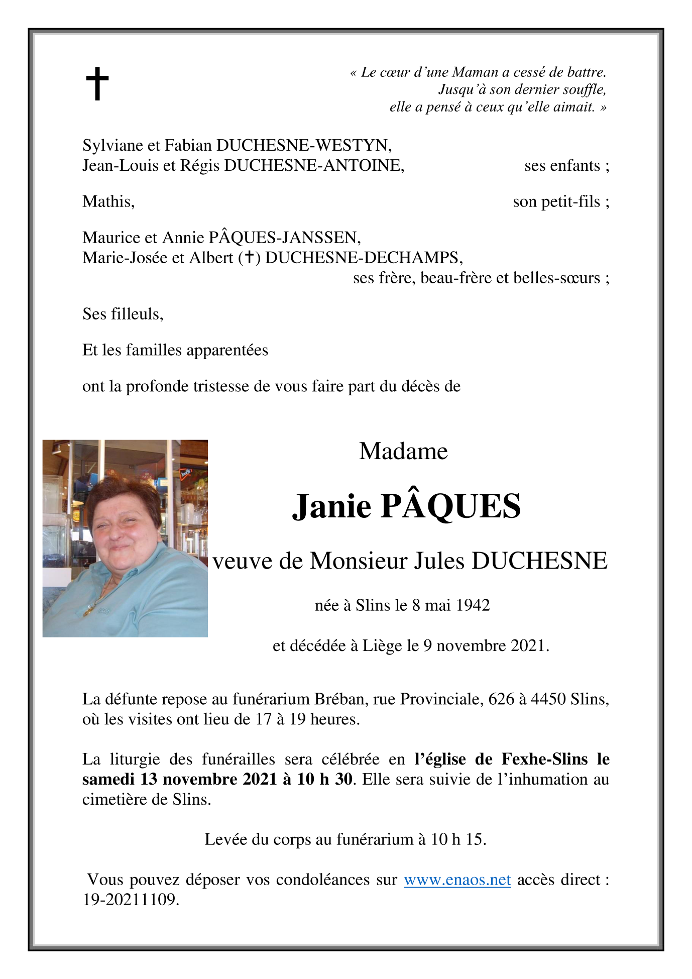 Madame Janie PÂQUES veuve de Jules DUCHESNE