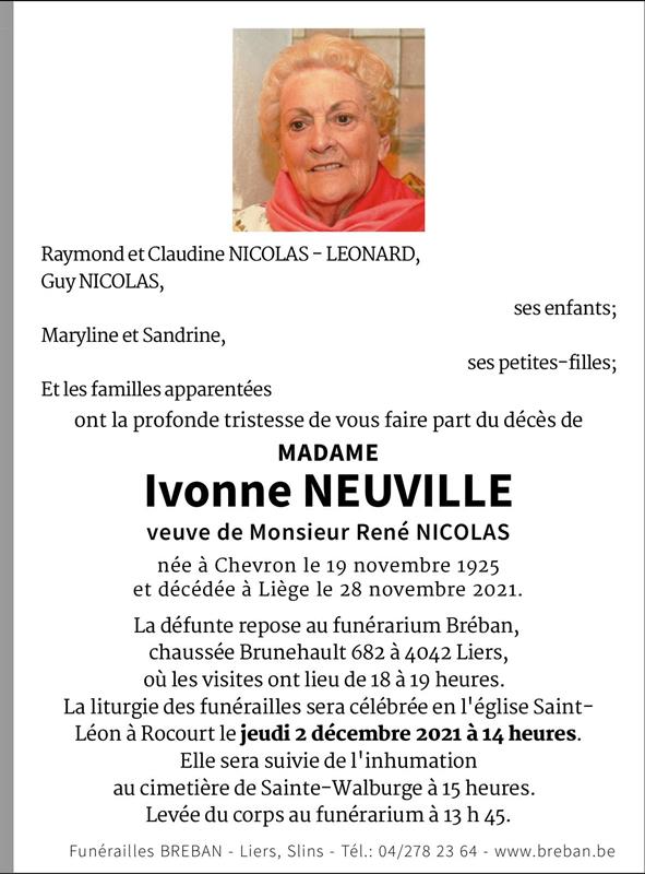 Madame Ivonne NEUVILLE veuve de René NICOLAS