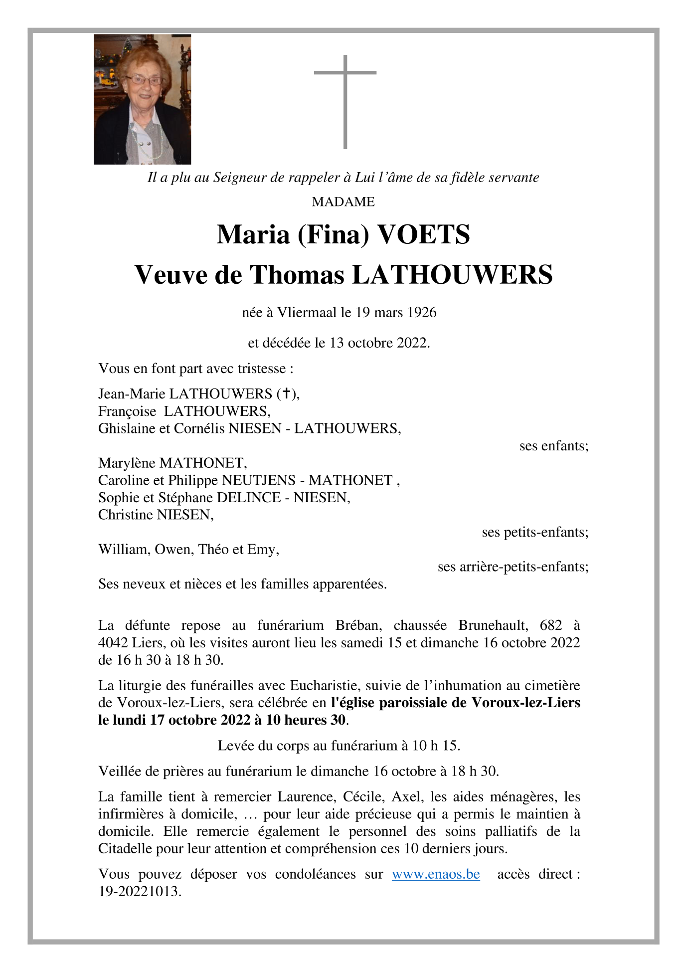 Madame Maria (Fina) VOETS veuve de Thomas LATHOUWERS