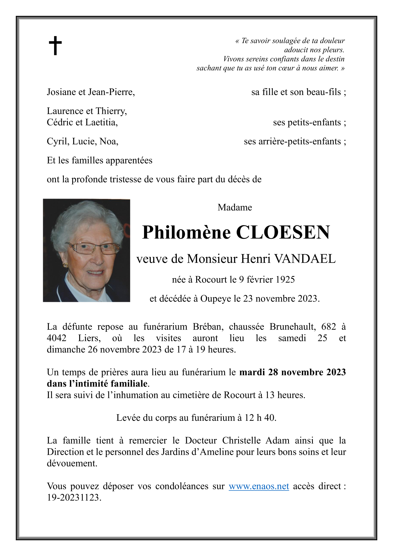 Madame Philomène CLOESEN veuve de Henri VANDAEL
