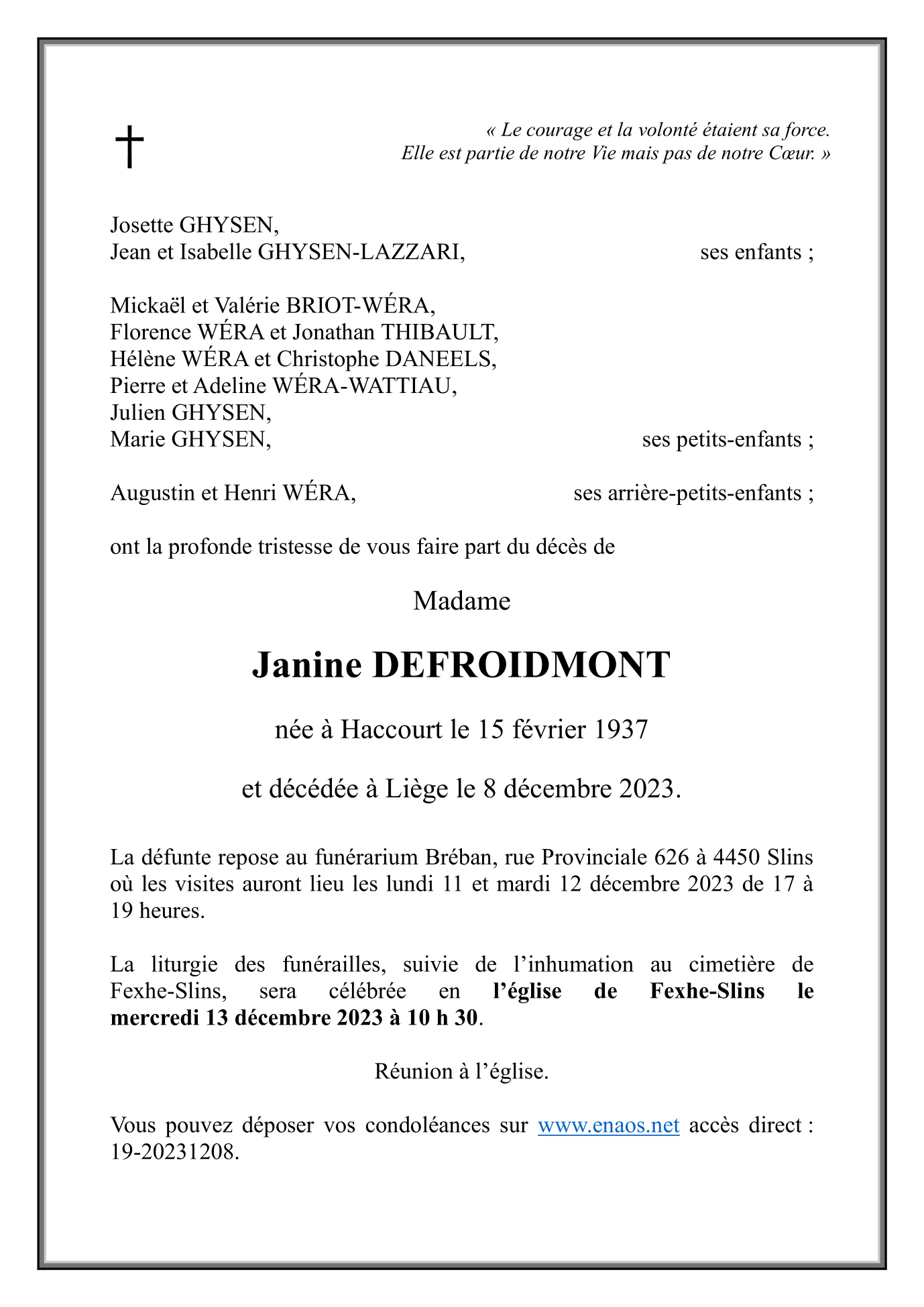 Décédée à Liège (4000) le vendredi 8 décembre 2023 à l'âge de 86 ans