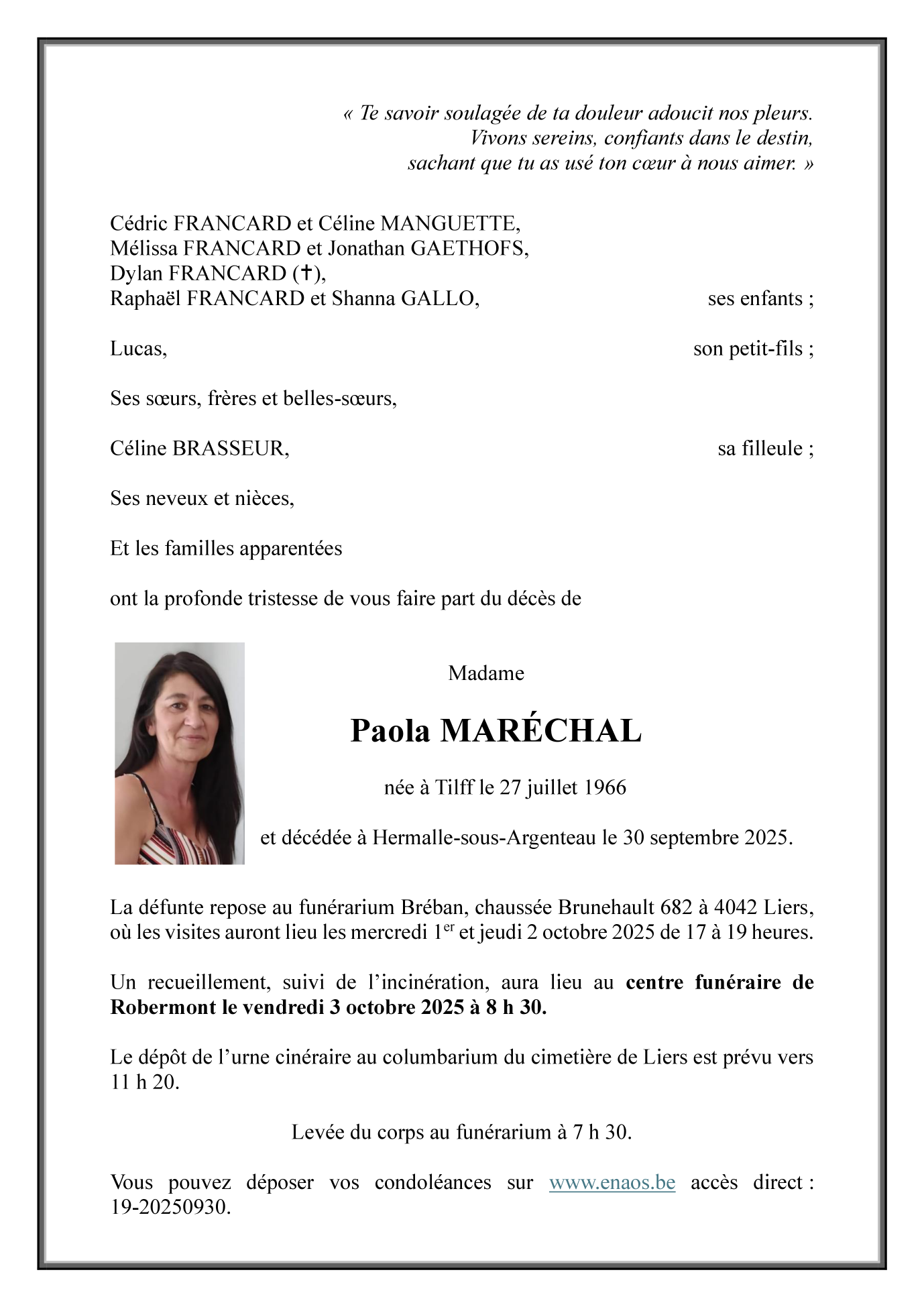 Décédée à Hermalle-sous-Argenteau (4681) le mardi 30 septembre 2025 à l'âge de 59 ans