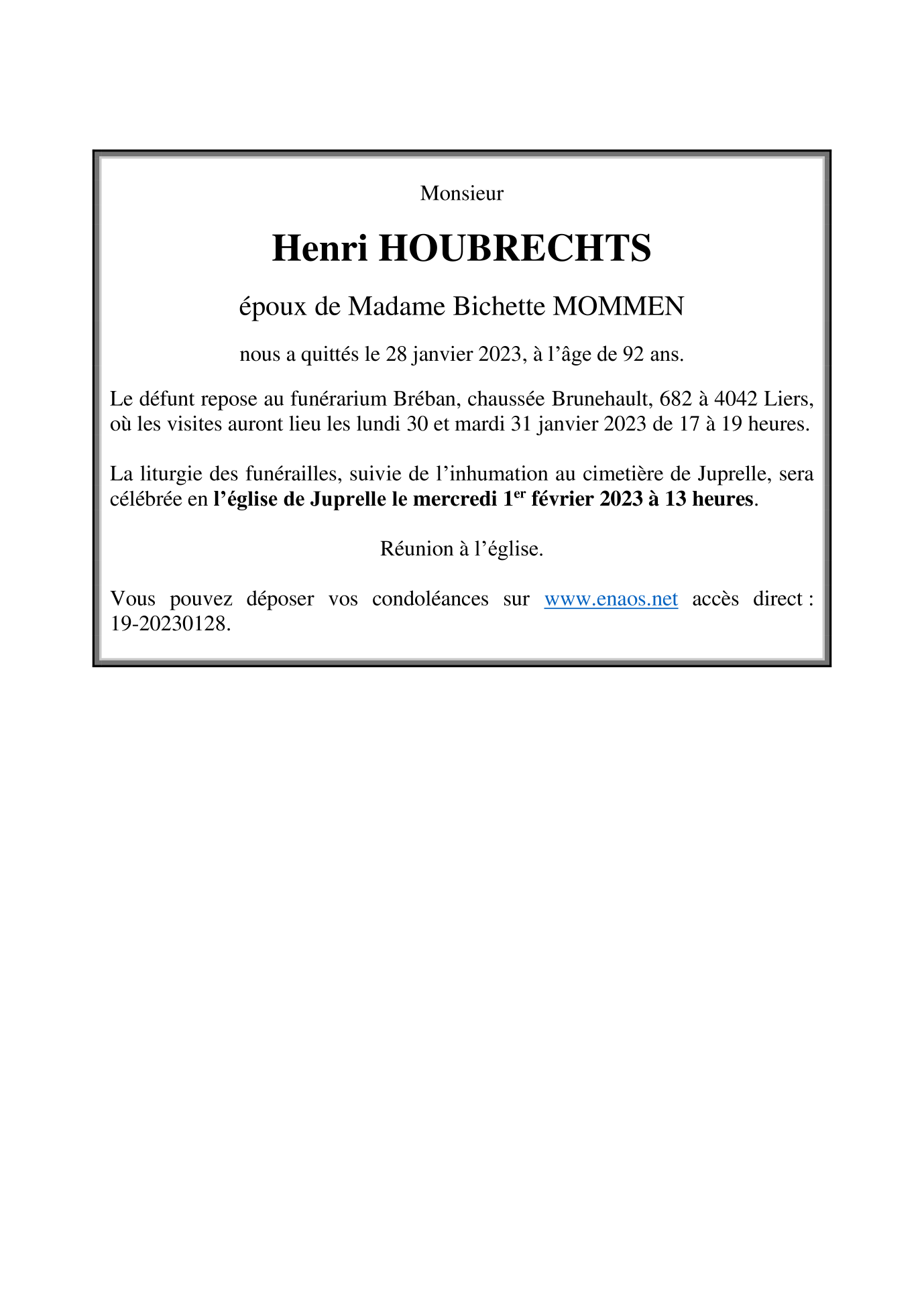 Monsieur Henri HOUBRECHTS époux de Bichette MOMMEN