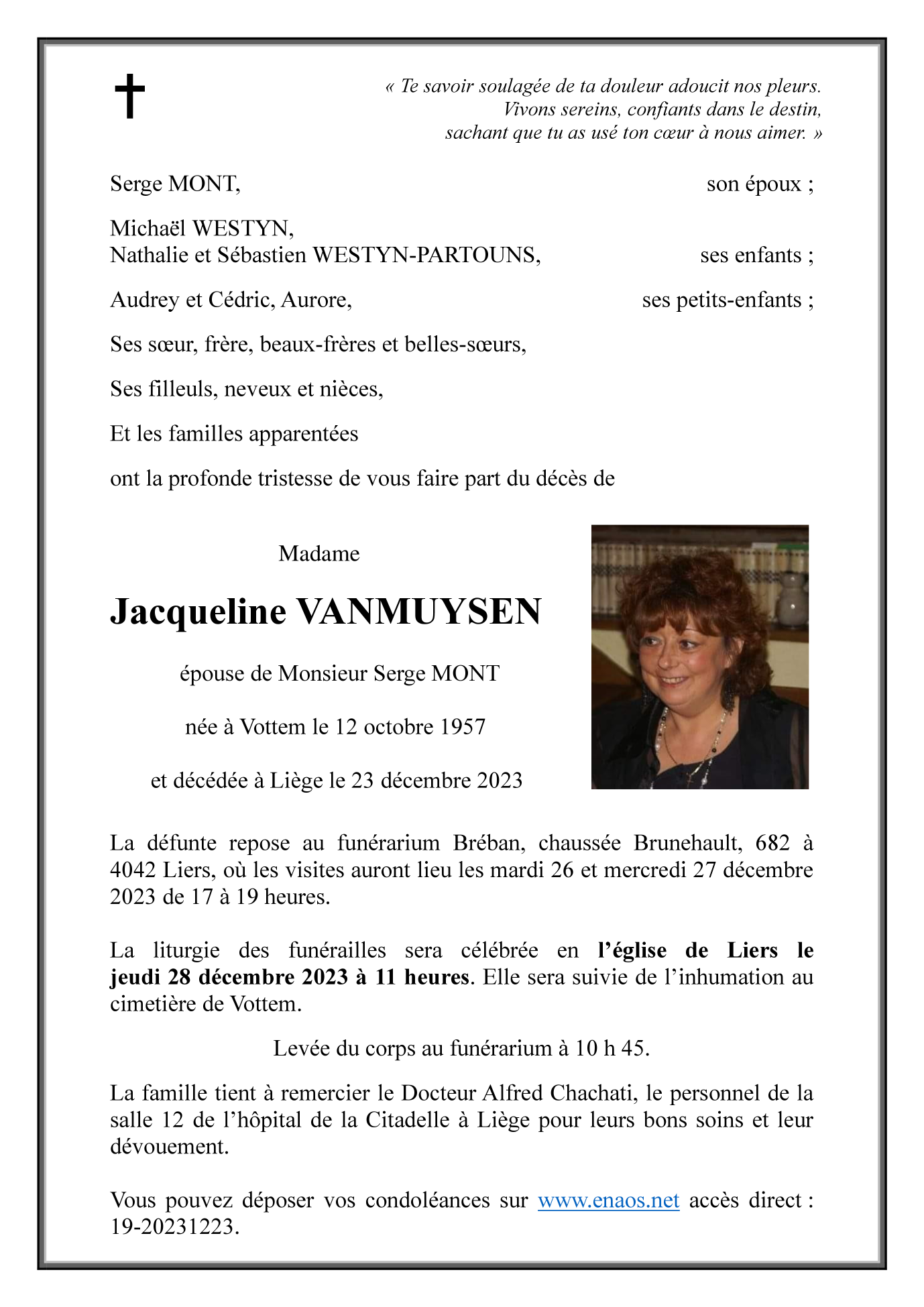 Madame Jacqueline VANMUYSEN épouse de Serge MONT