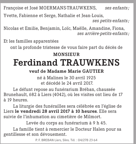 Monsieur Ferdinand TRAUWKENS veuf Marie GAUTIER