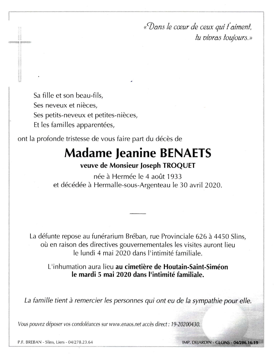 Madame Jeanine BENAETS veuve de Joseph TROQUET