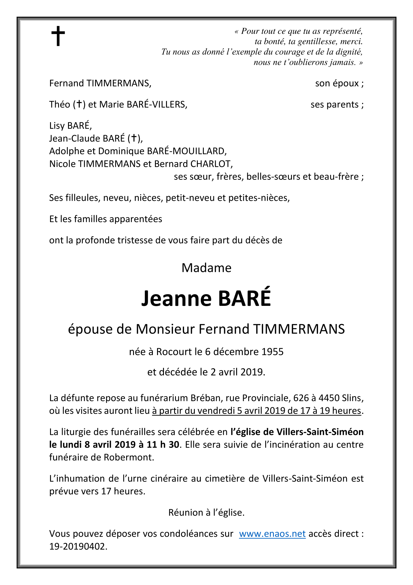 Madame Jeanne BARÉ épouse de Fernand TIMMERMANS