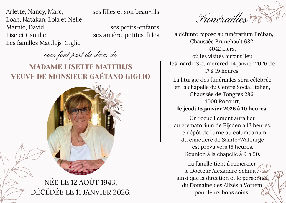 Décédée à Vottem (4041) le dimanche 11 janvier 2026 à l'âge de 82 ans