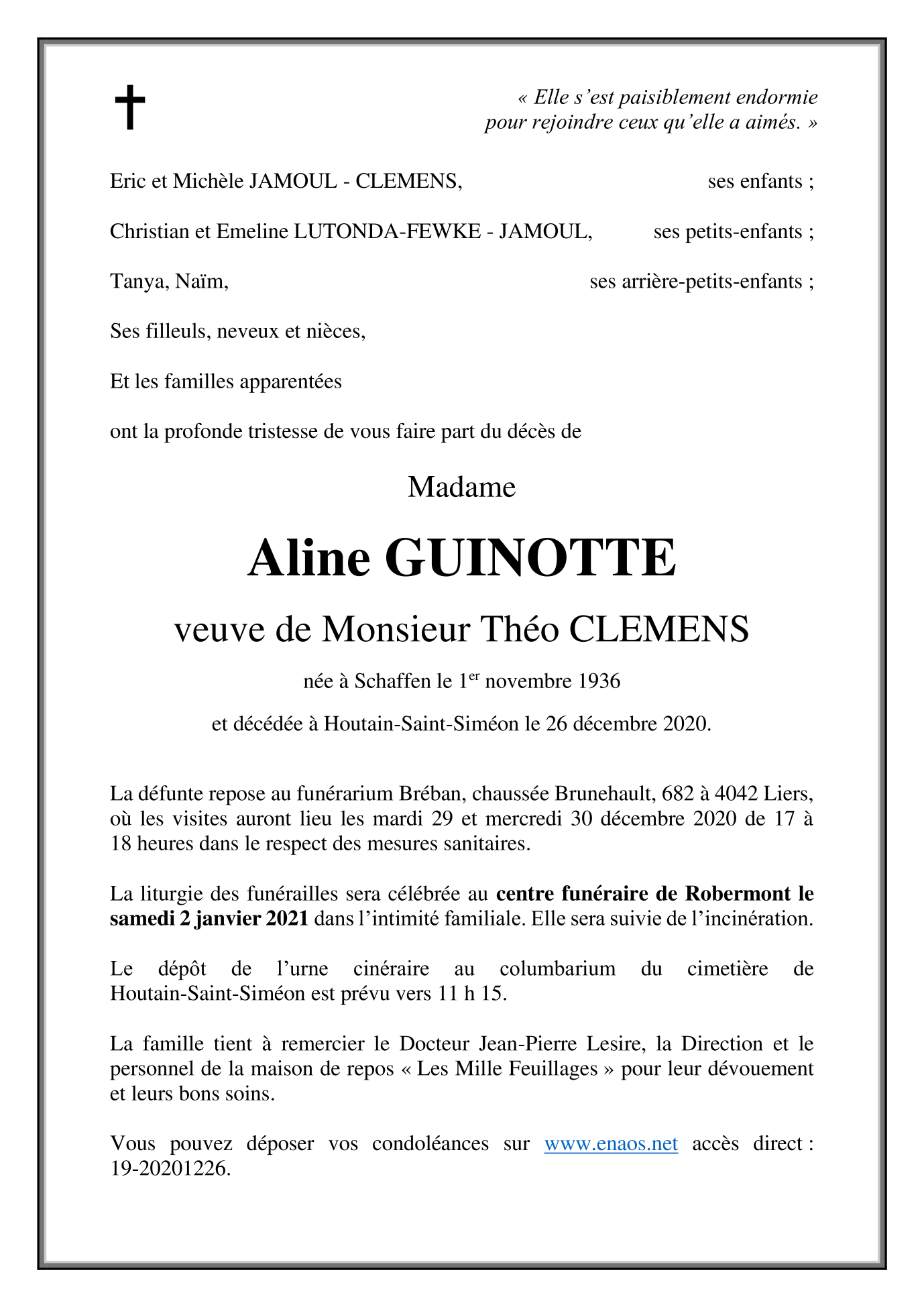 Madame Aline GUINOTTE veuve de Théo CLEMENS