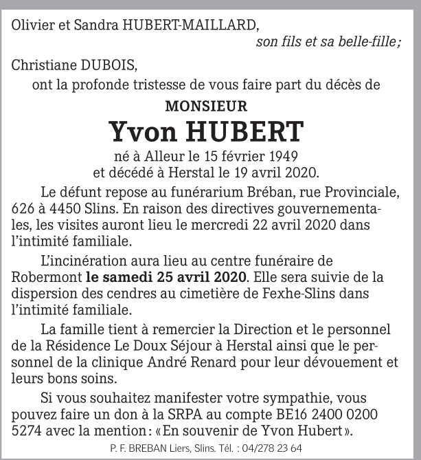 Décédé à Herstal (4040) le dimanche 19 avril 2020 à l'âge de 71 ans