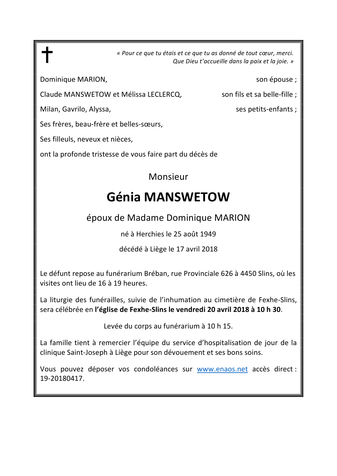 Monsieur Génia MANSWETOW époux de Dominqiue MARION