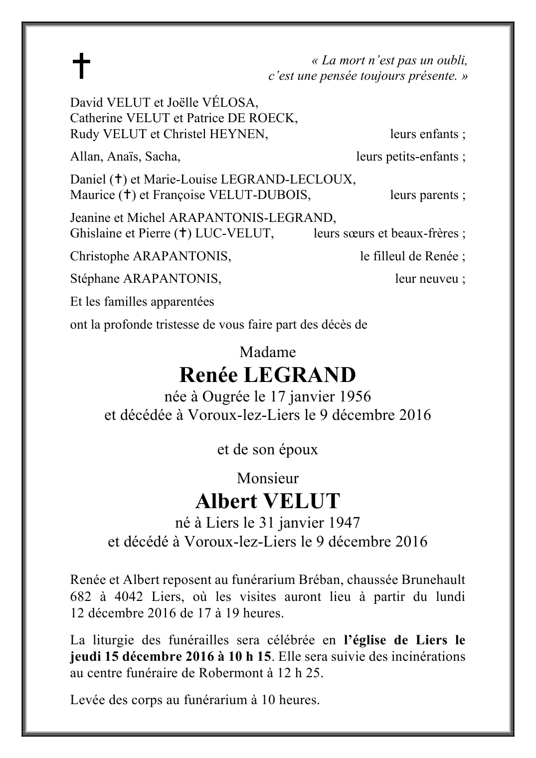 Décédée à Voroux-lez-Liers (4451) le vendredi 9 décembre 2016 à l'âge de 60 ans