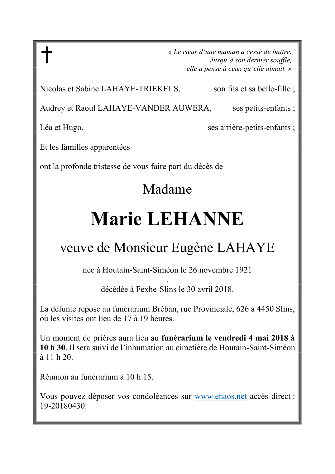Madame Marie LEHANNE veuve d'Eugène LAHAYE