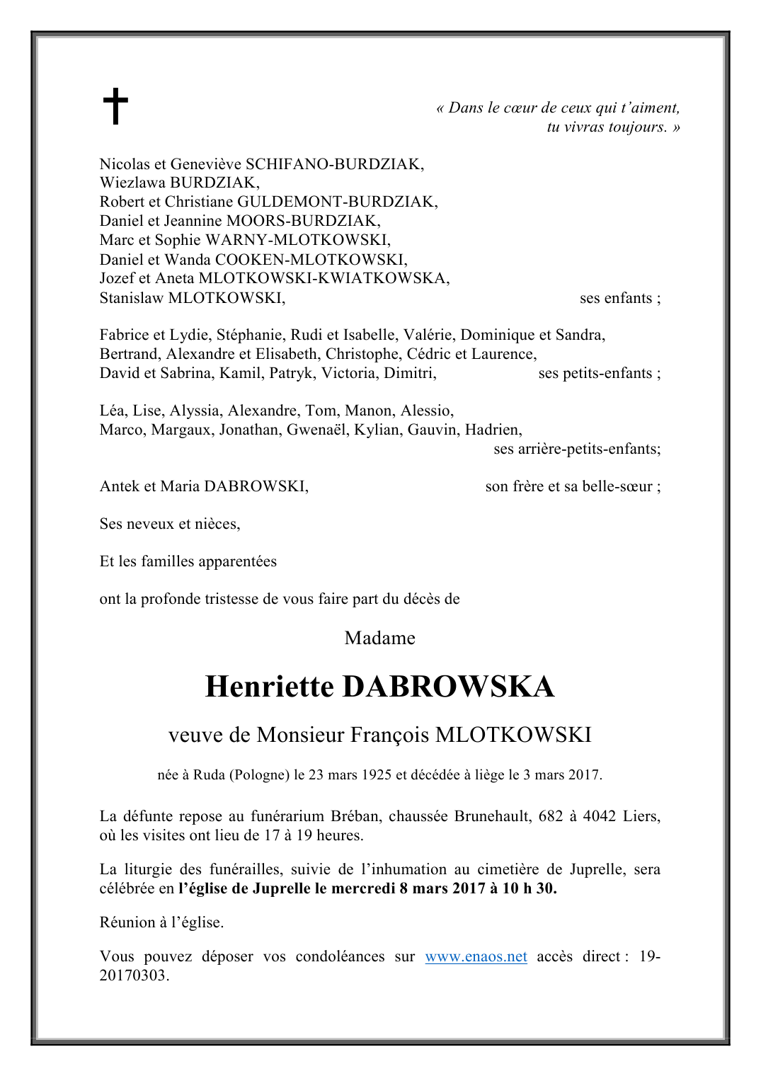 Madame Henriette DABROWSKA veuve de François MLOTKOWSKI