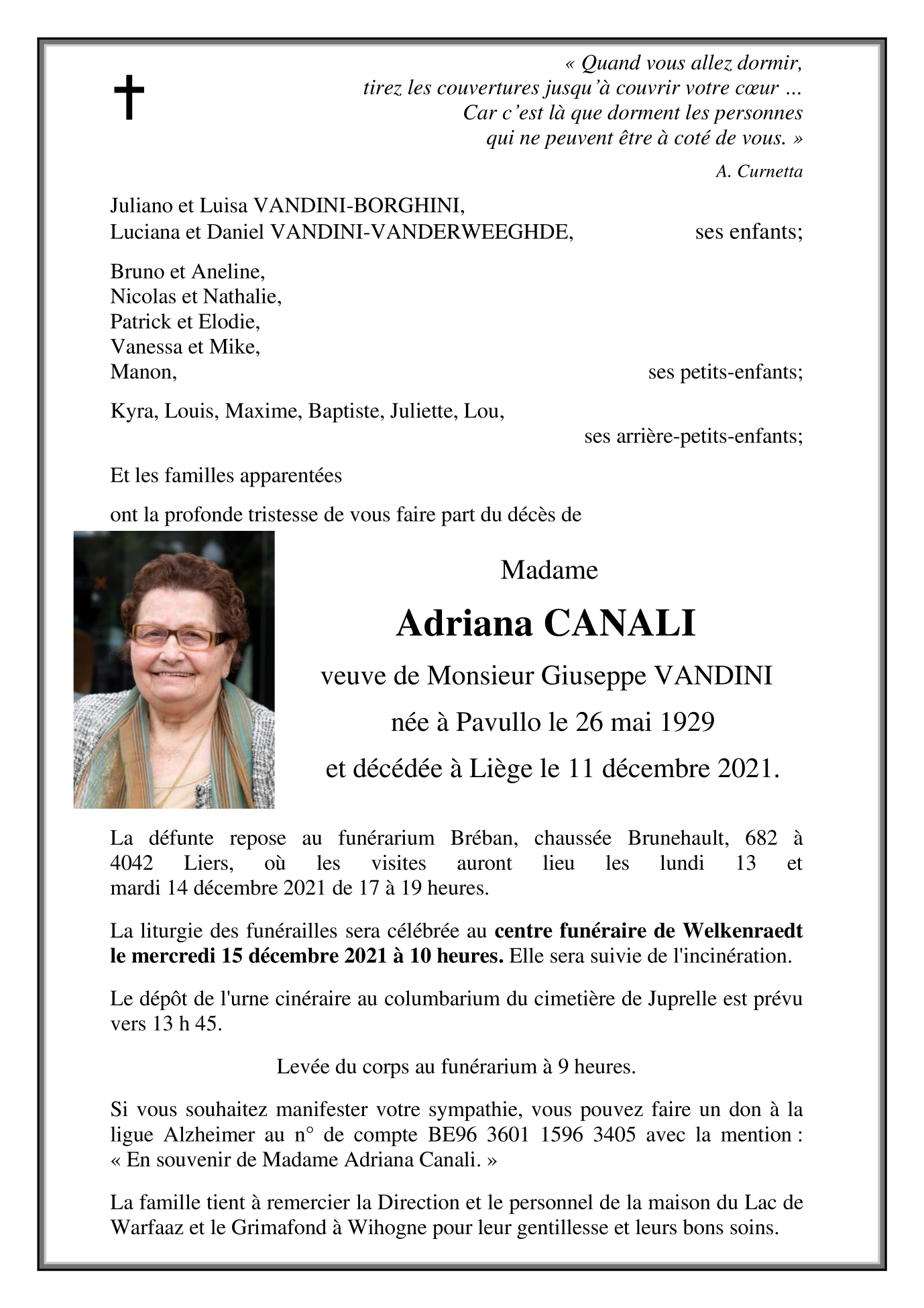 Madame Adriana CANALI veuve de Giuseppe VANDINI