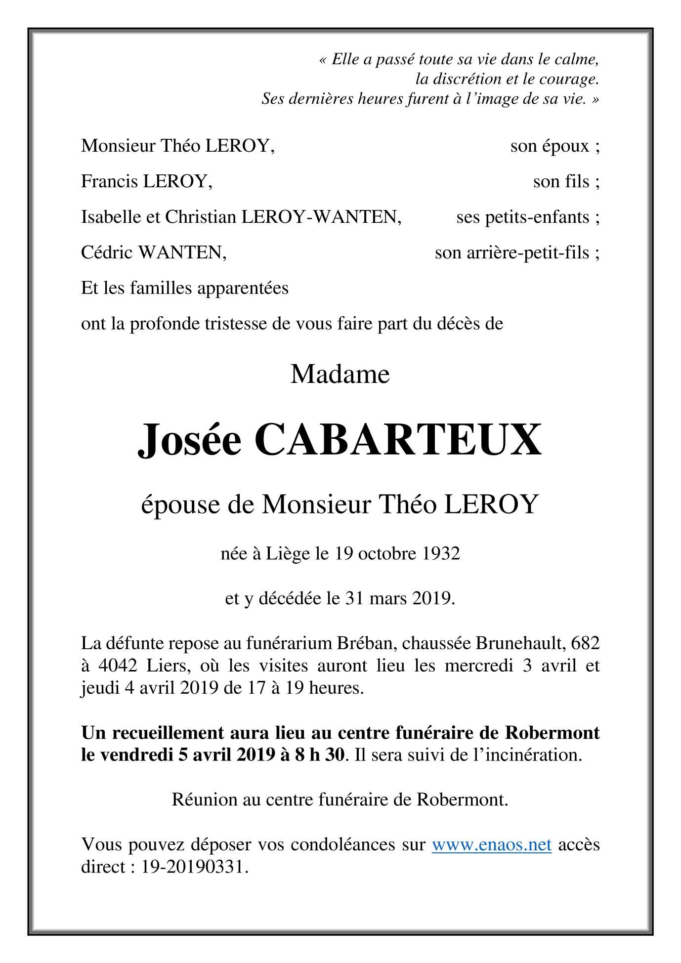 Madame Josée CABARTEUX épouse de Théo LEROY