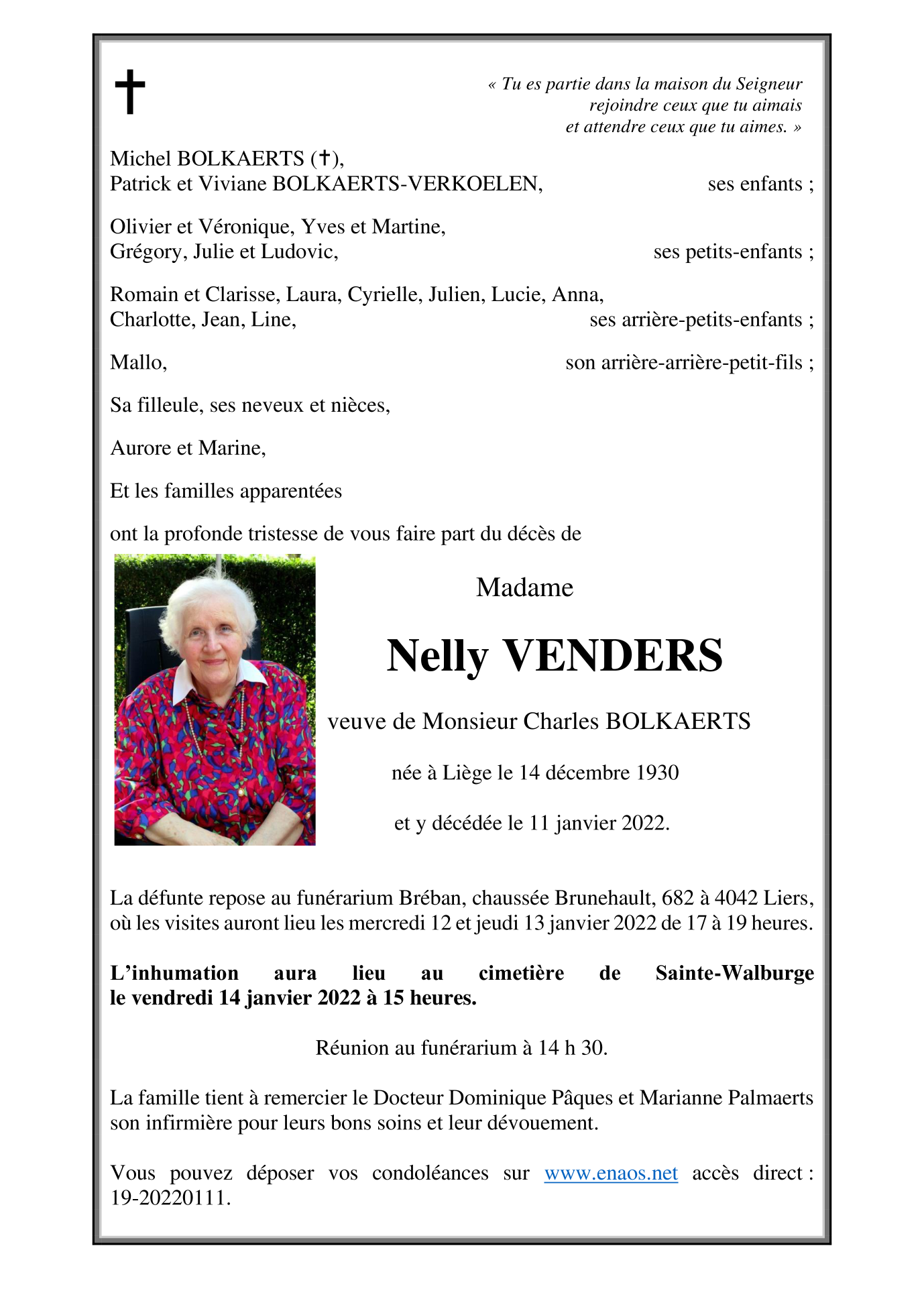 Décédée à Liège (4000) le mardi 11 janvier 2022 à l'âge de 91 ans