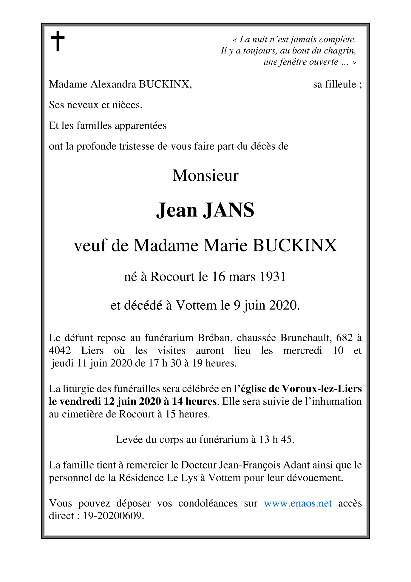 Monsieur Jean JANS veuf de Marie BUCKINX