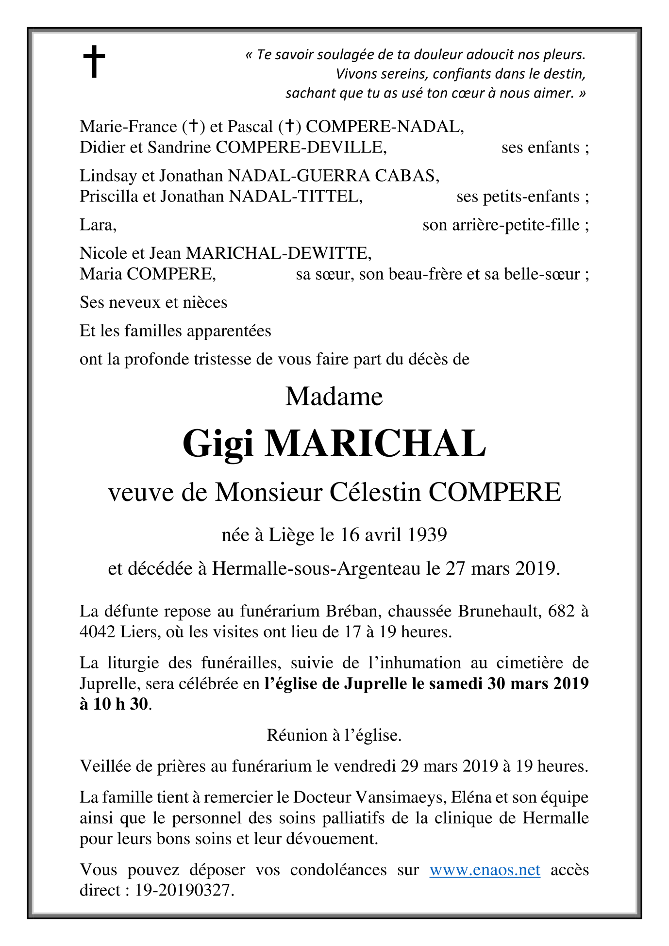 Madame Gigi MARICHAL veuve de Célestin COMPERE