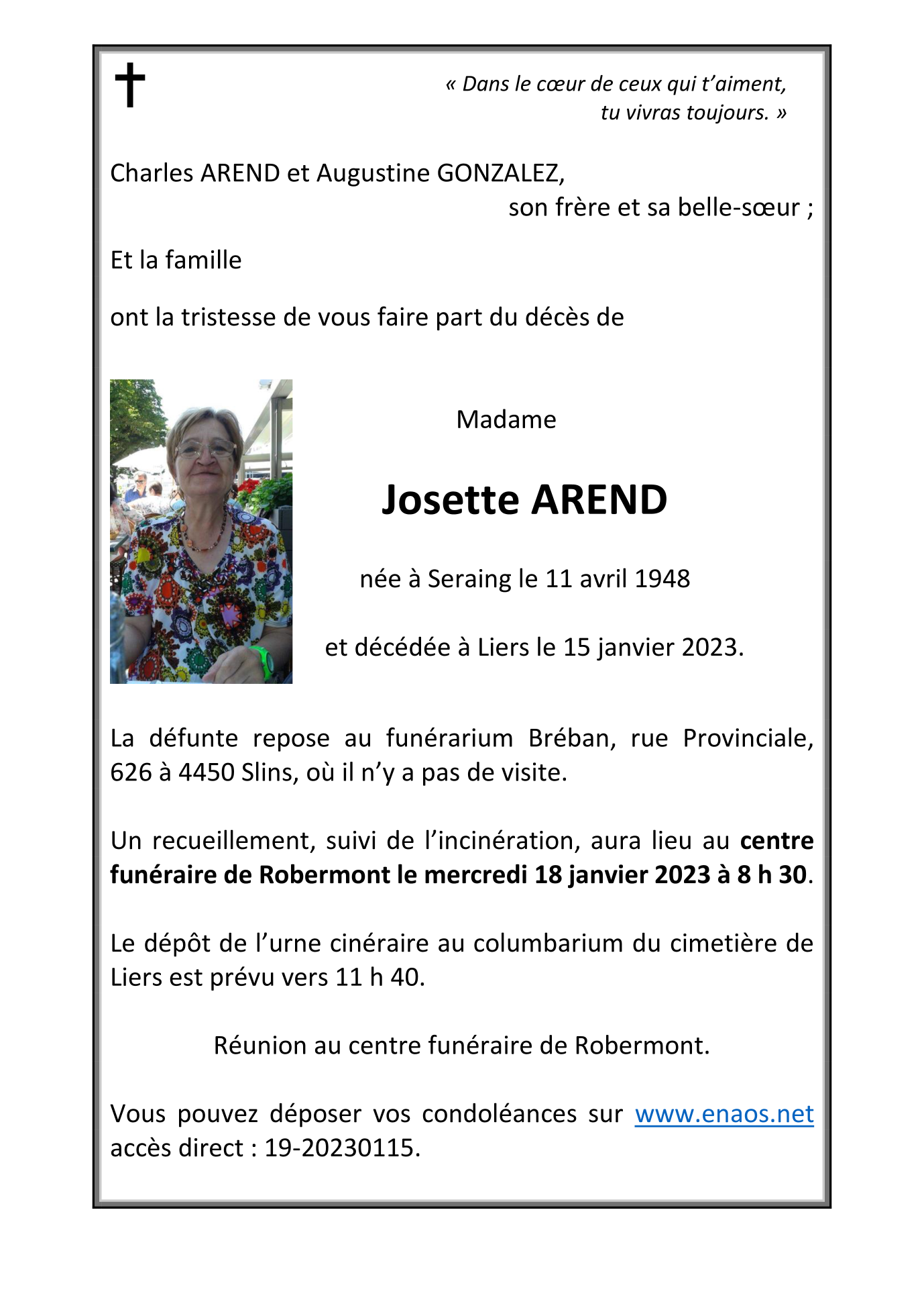 Décédée à Liers (4042) le dimanche 15 janvier 2023 à l'âge de 74 ans