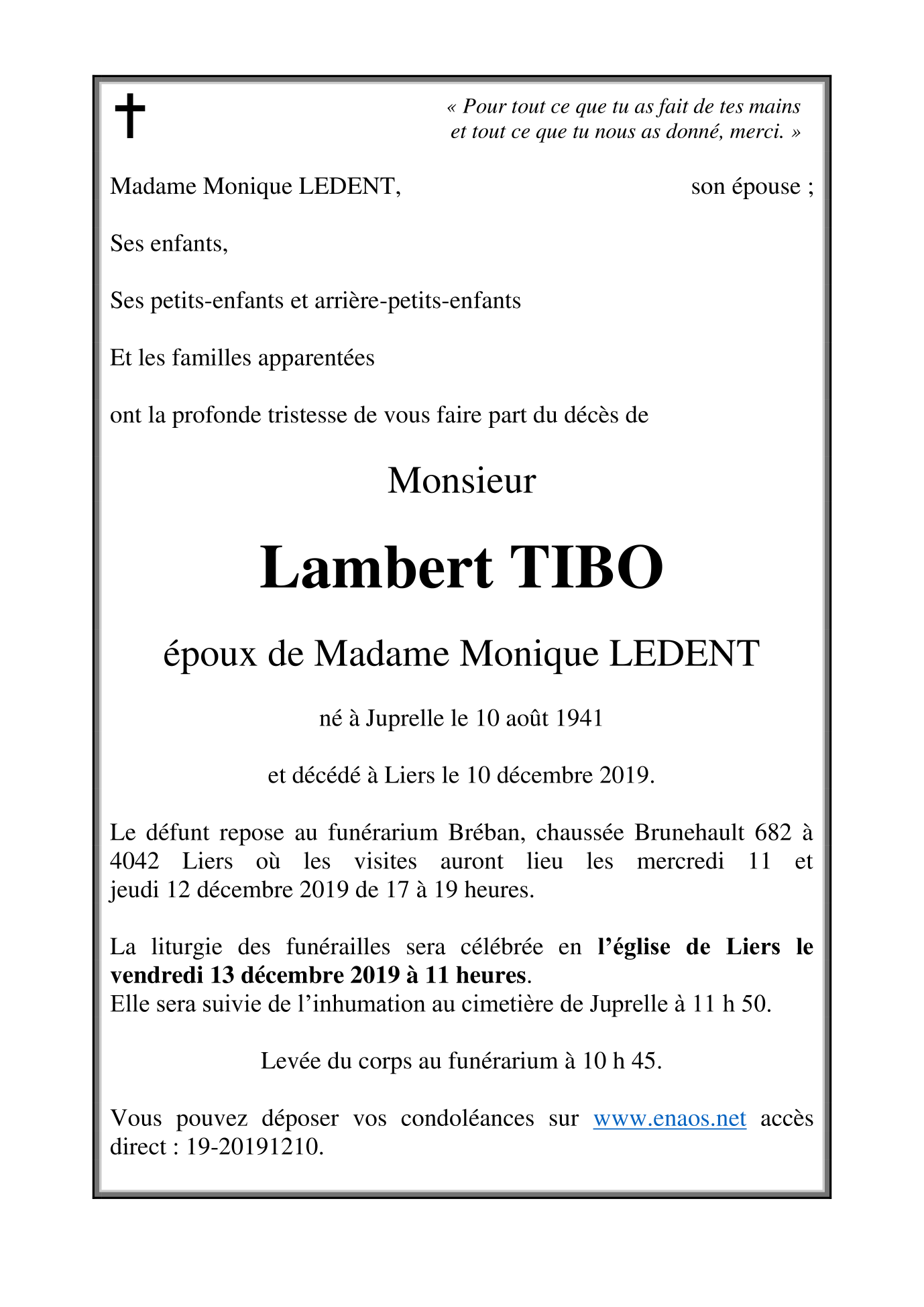 Monsieur Lambert TIBO époux de Monique LEDENT