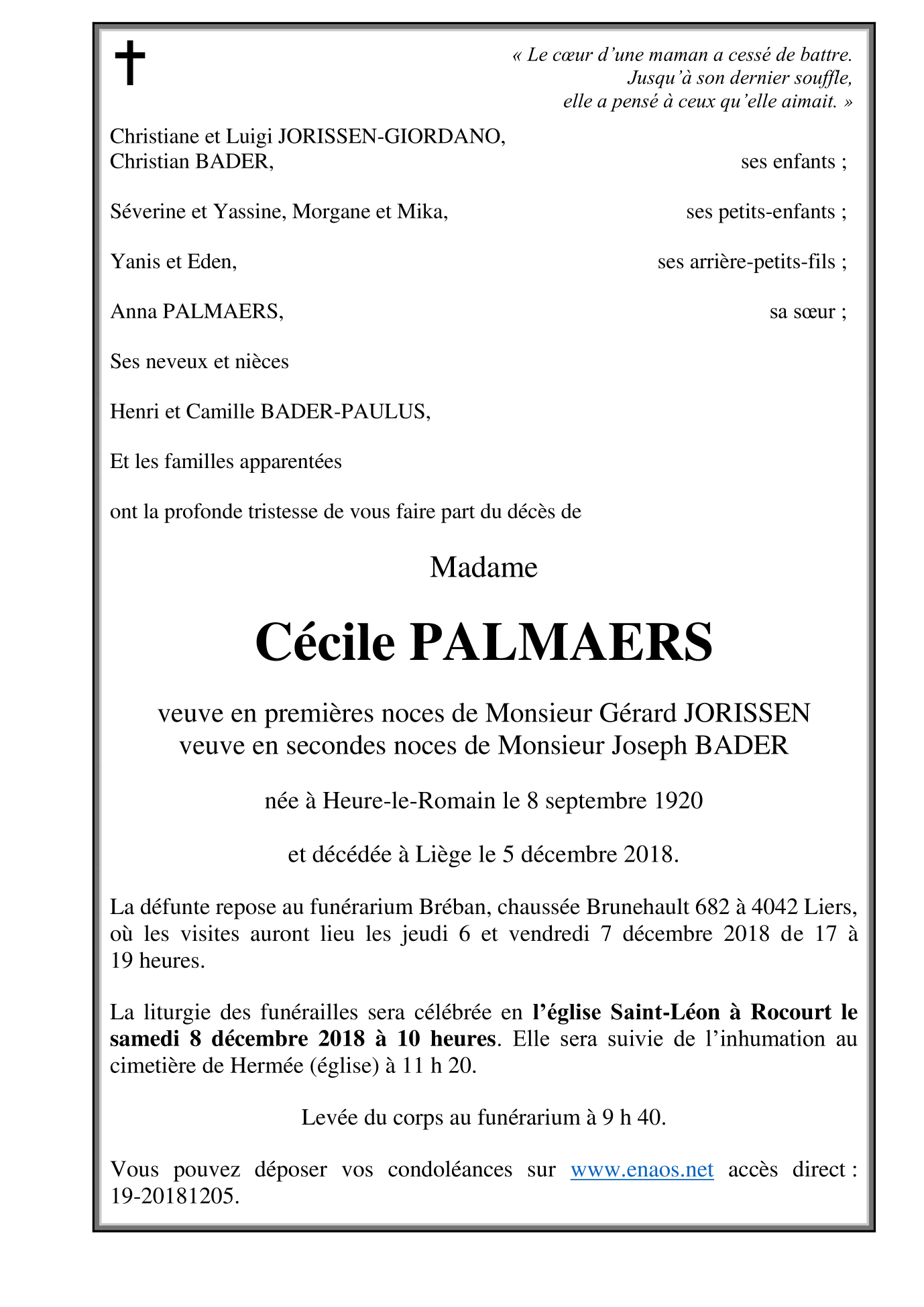 Madame Cécile PALMAERS veuve de Joseph BADER