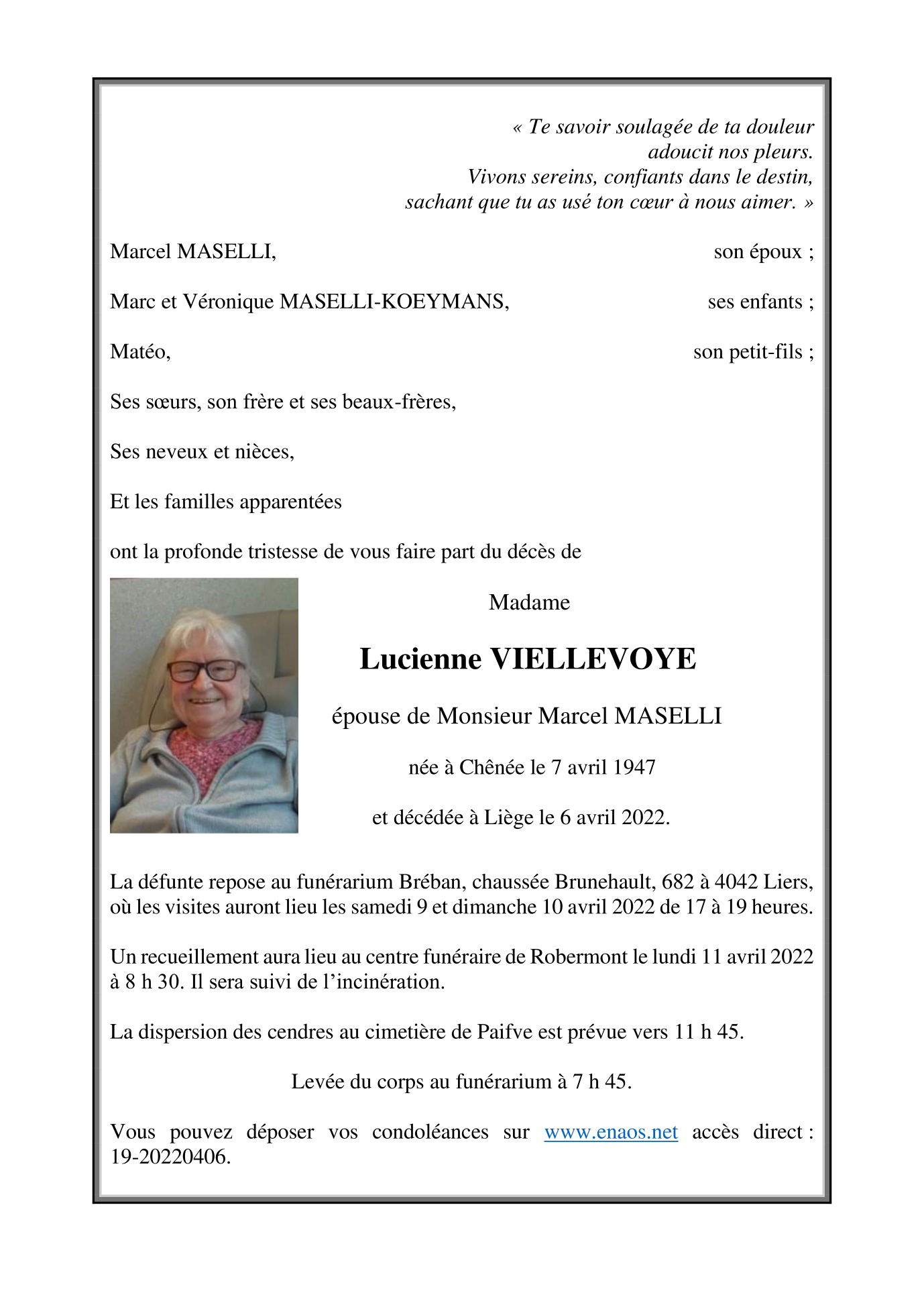 Décédée à Liège (4000) le mercredi 6 avril 2022 à l'âge de 74 ans