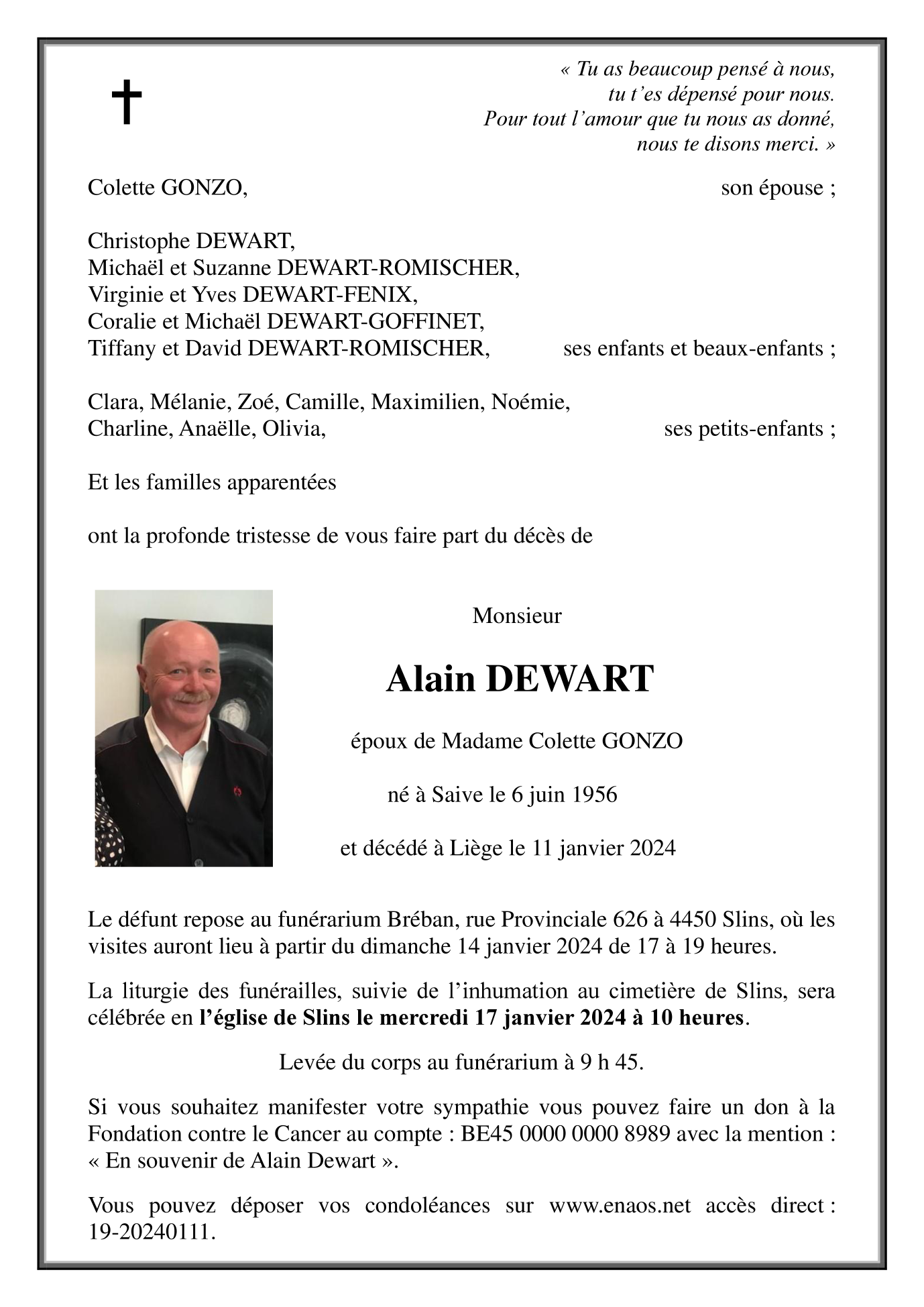 Décédé à Liège (4000) le jeudi 11 janvier 2024 à l'âge de 67 ans