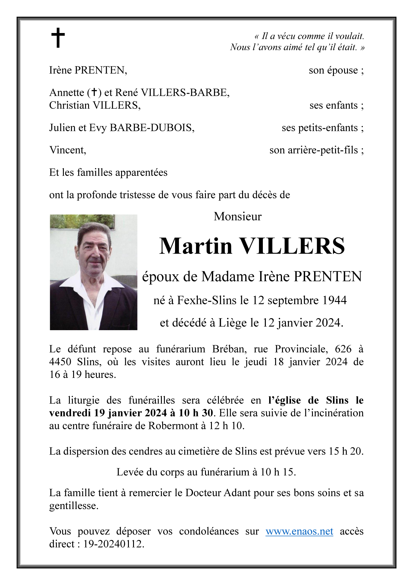 Monsieur Martin VILLERS époux de Irène PRENTEN