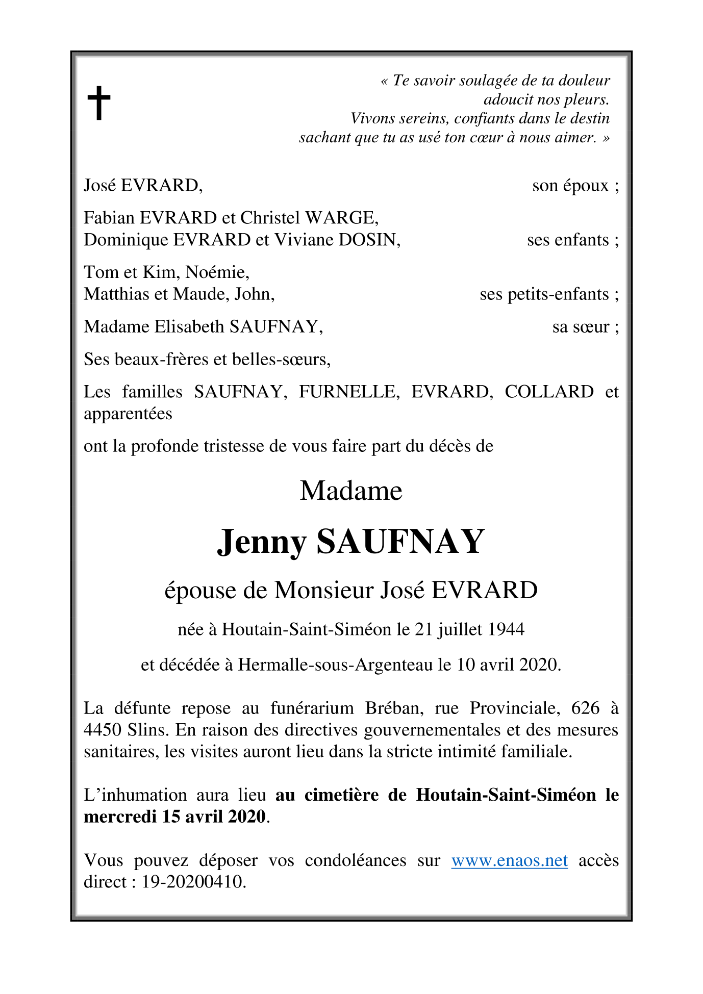 Madame Jenny SAUFNAY épouse de José EVRARD