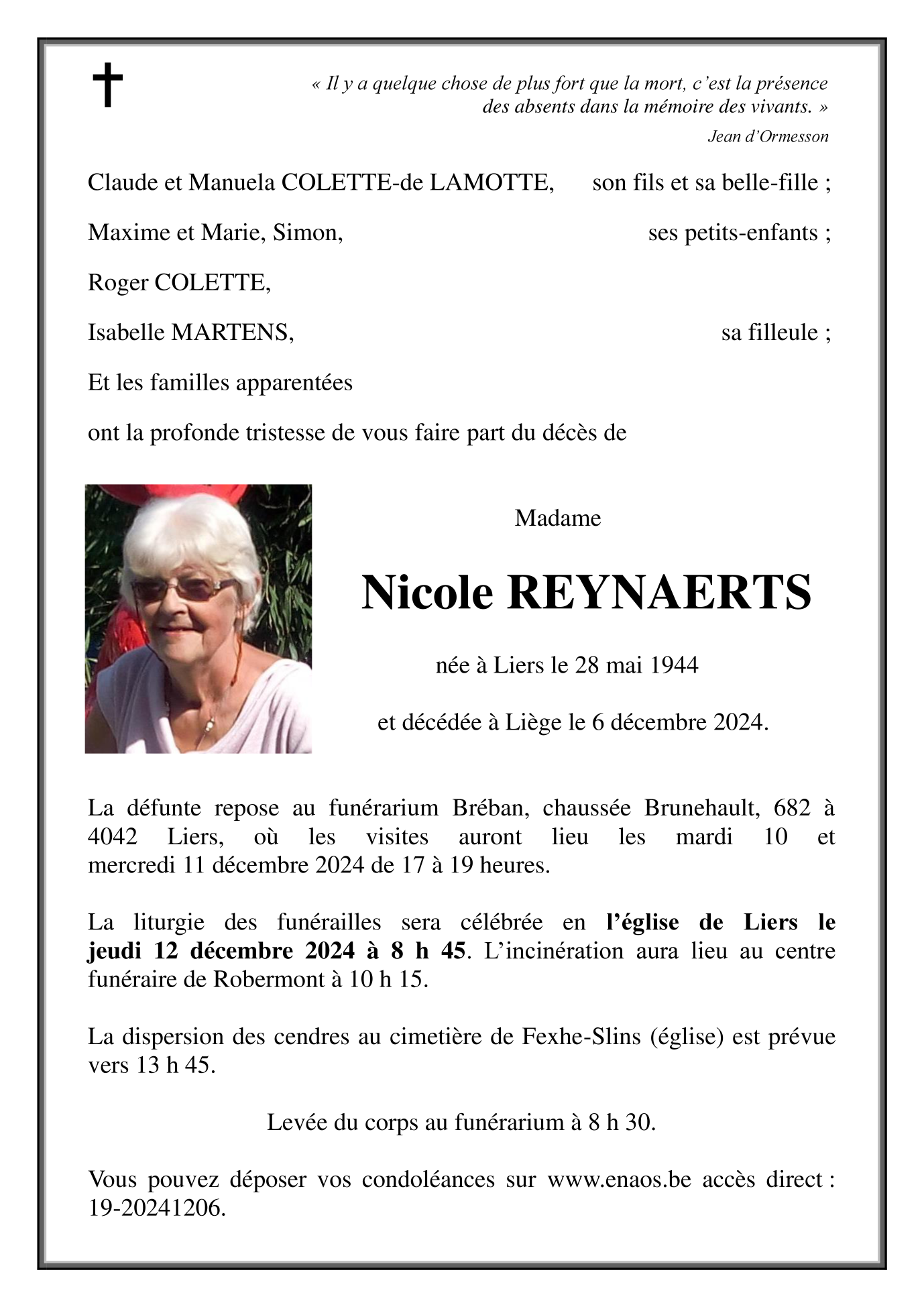 Décédée à Liège (4000) le vendredi 6 décembre 2024 à l'âge de 80 ans