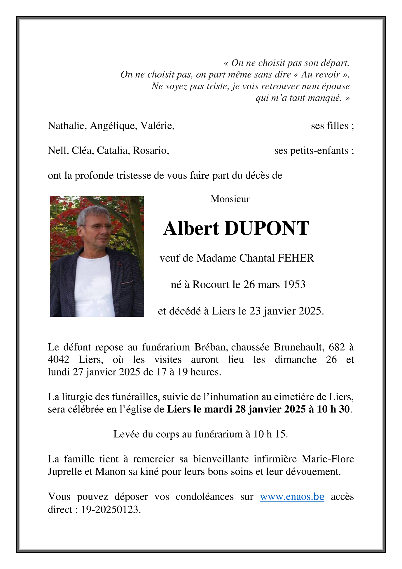 Monsieur Albert DUPONT veuf de Chantal FEHER