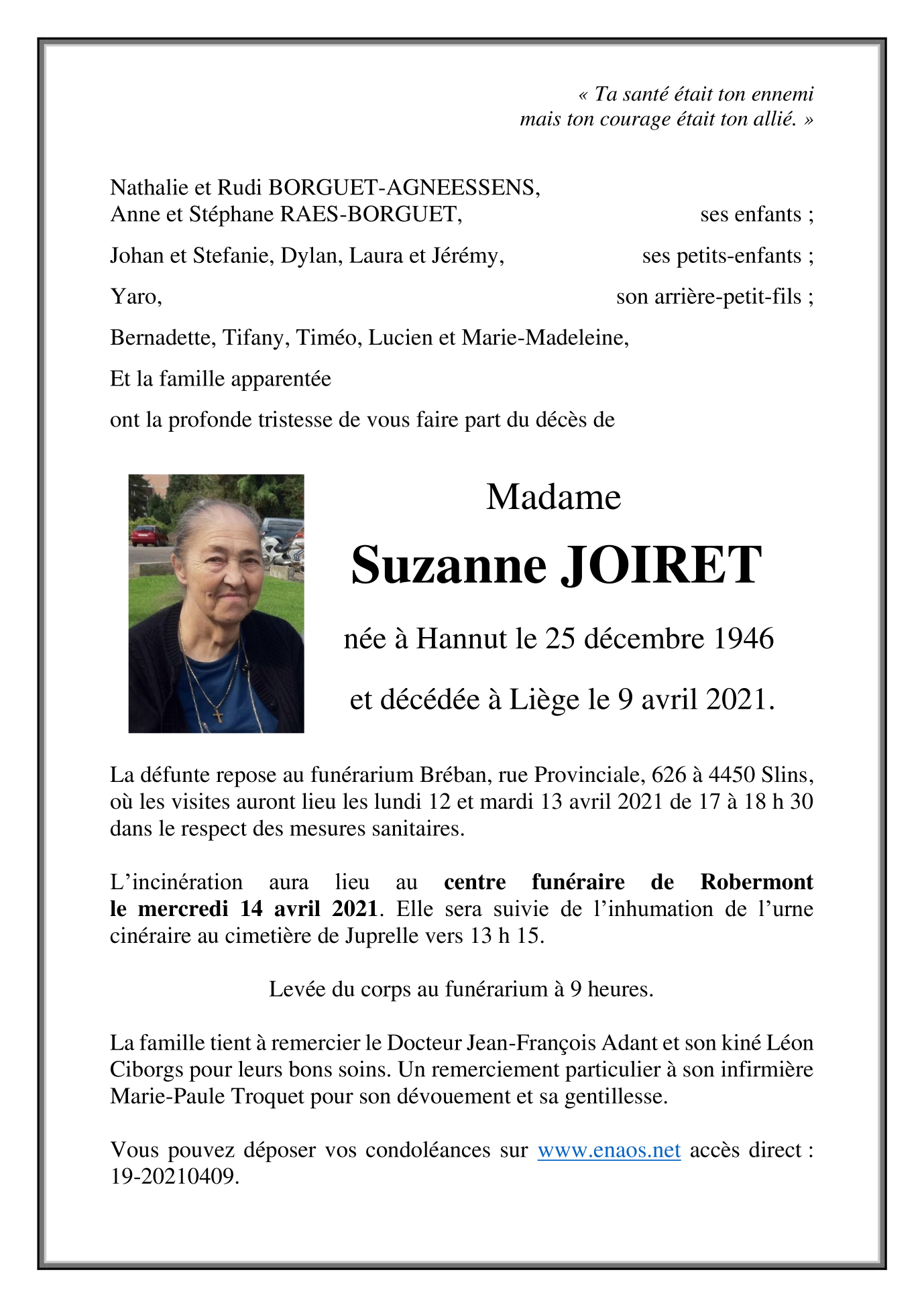 Décédée à Liège (4000) le vendredi 9 avril 2021 à l'âge de 74 ans