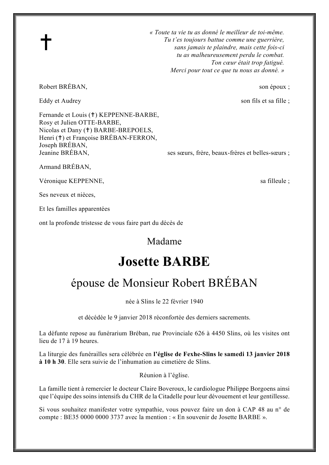 Madame Josette BARBE épouse de Robert BRÉBAN