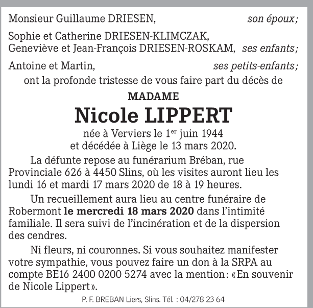 Décédée à Liège (4000) le vendredi 13 mars 2020 à l'âge de 75 ans
