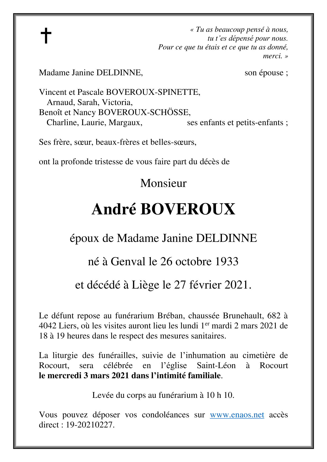 Monsieur André BOVEROUX époux de Janine DELDINNE