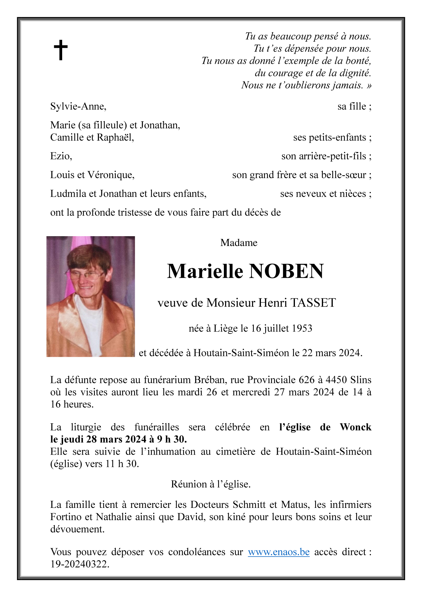 Décédée à Houtain-Saint-Siméon (4682) le vendredi 22 mars 2024 à l'âge de 70 ans