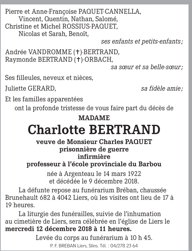 Madame Charlotte BERTRAND veuve de Charles PAQUET