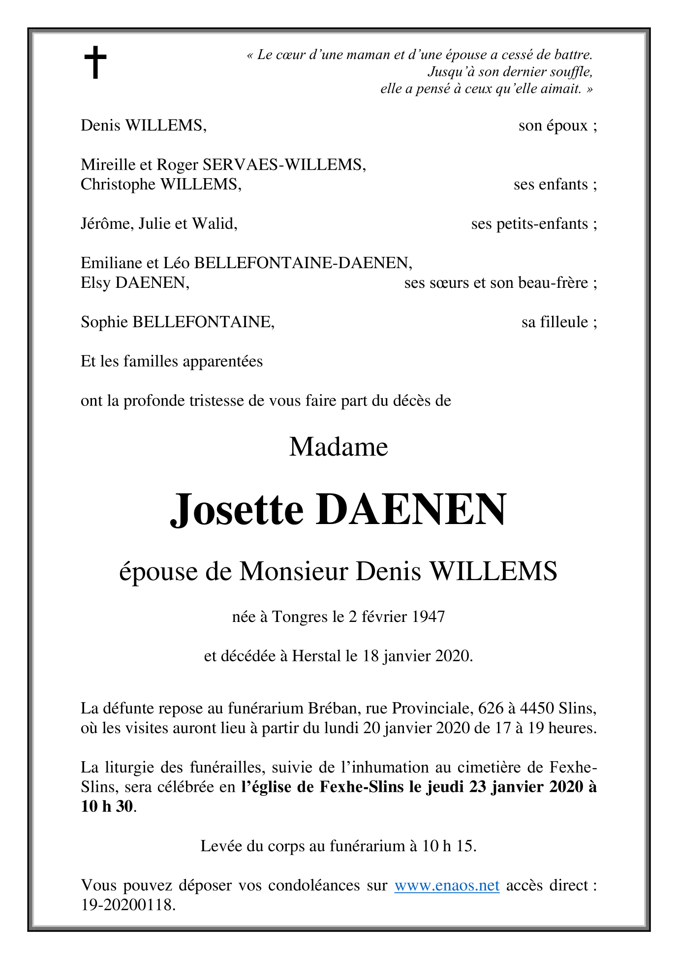 Madame Josette DAENEN épouse de Denis WILLEMS
