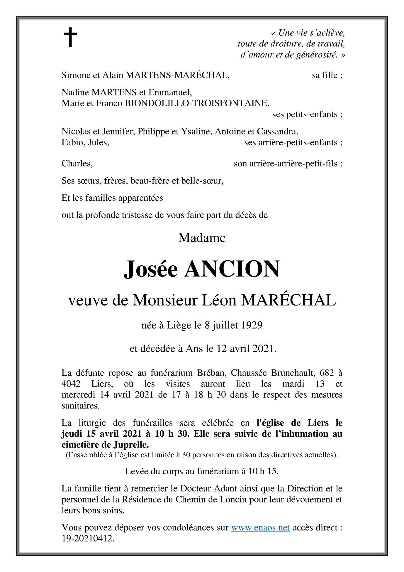 Madame Josée ANCION veuve de Léon MARÉCHAL